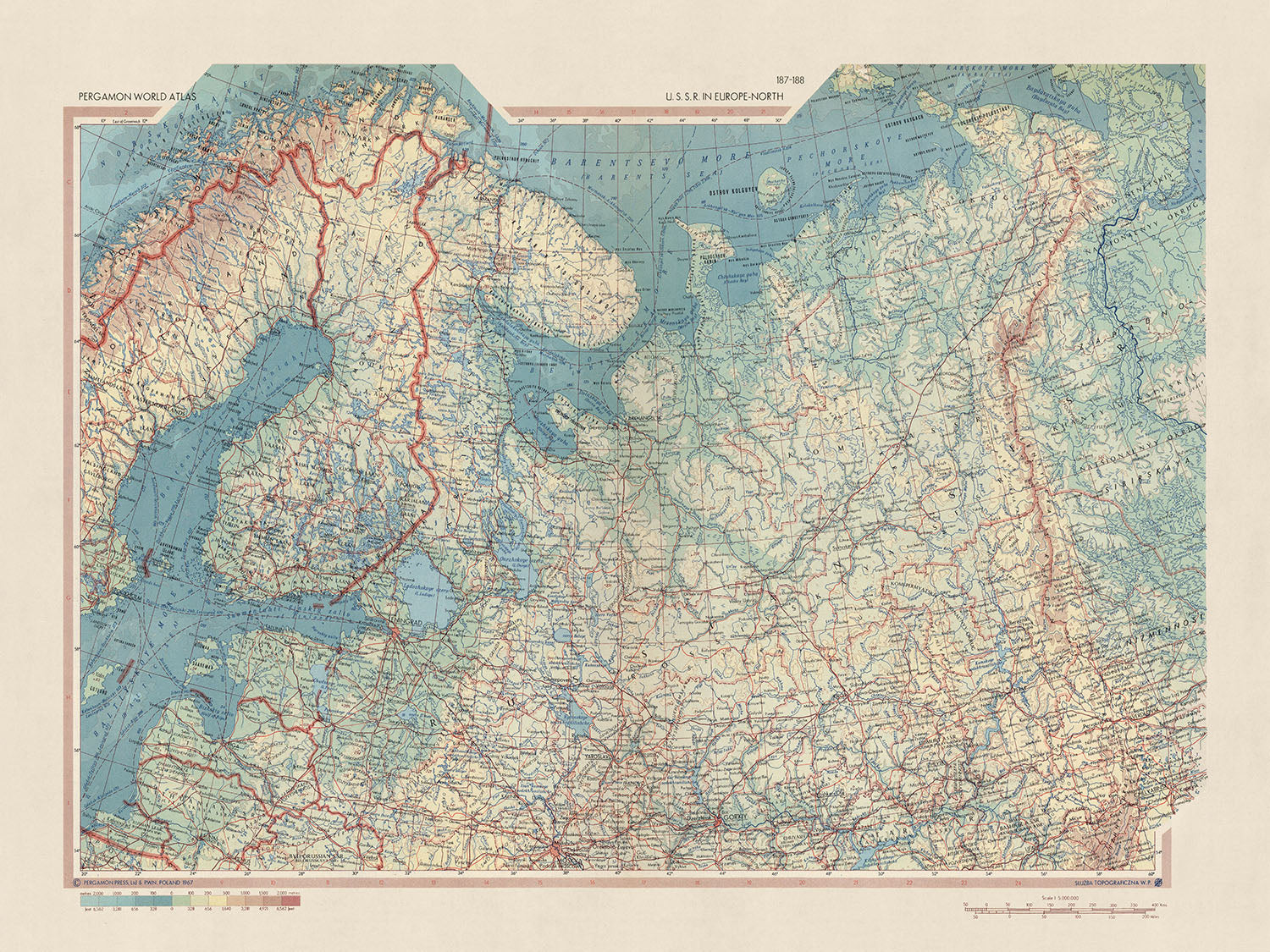 Old Map of USSR in North Europe, 1967: Estonia, Finland, Latvia, Russia, Political & Physical Atlas