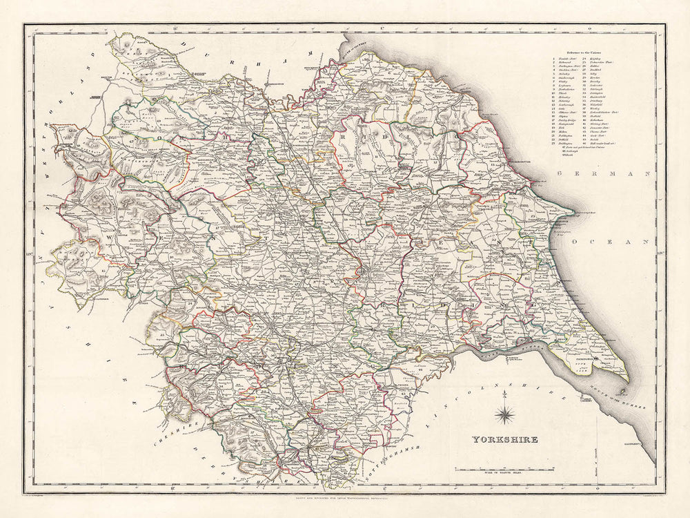 This stunning piece not only holds immense historical value but also serves as an excellent talking point. Whether it's the profound transformation of Leeds from a modest market borough to a bustling industrial city or the enduring charm of York, this map delivers a fascinating insight into Yorkshire's past. It is a perfect piece for historians, cartographers, or anyone with an interest in the rich tapestry of Yorkshire's past. The map's timeless aesthetic makes it an excellent addition to any decor.