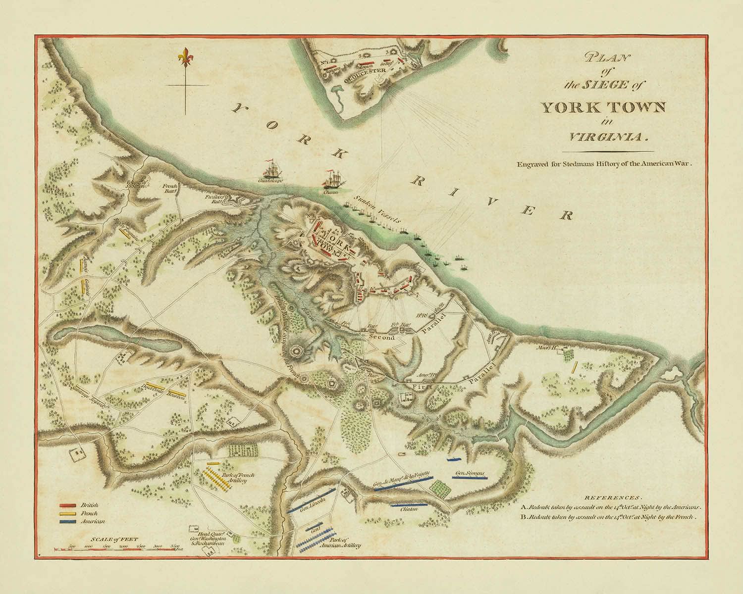 Old Military Map of the Siege of Yorktown by Stedman, 1793: Virginia, Gloucester, Redoubts 9 & 10, French Fleet, Washington