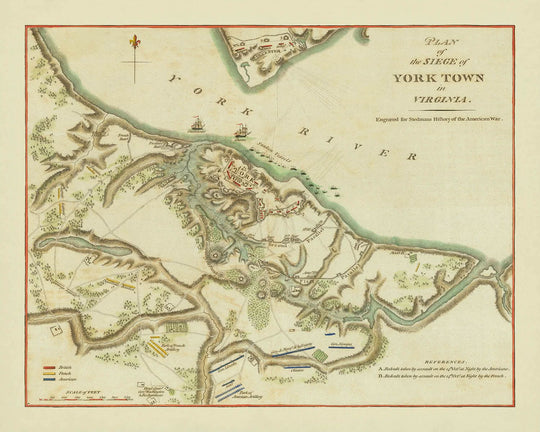 Historically, this map stands as a crucial document of the American struggle for independence. It captures the moment when the tide turned irreversibly against British colonial ambitions, marking the beginning of the end of the war. The Siege of Yorktown is celebrated as a symbol of international cooperation, with French forces playing a vital role in the American victory. This map, therefore, is not just a cartographic achievement but a celebration of a turning point in global history.