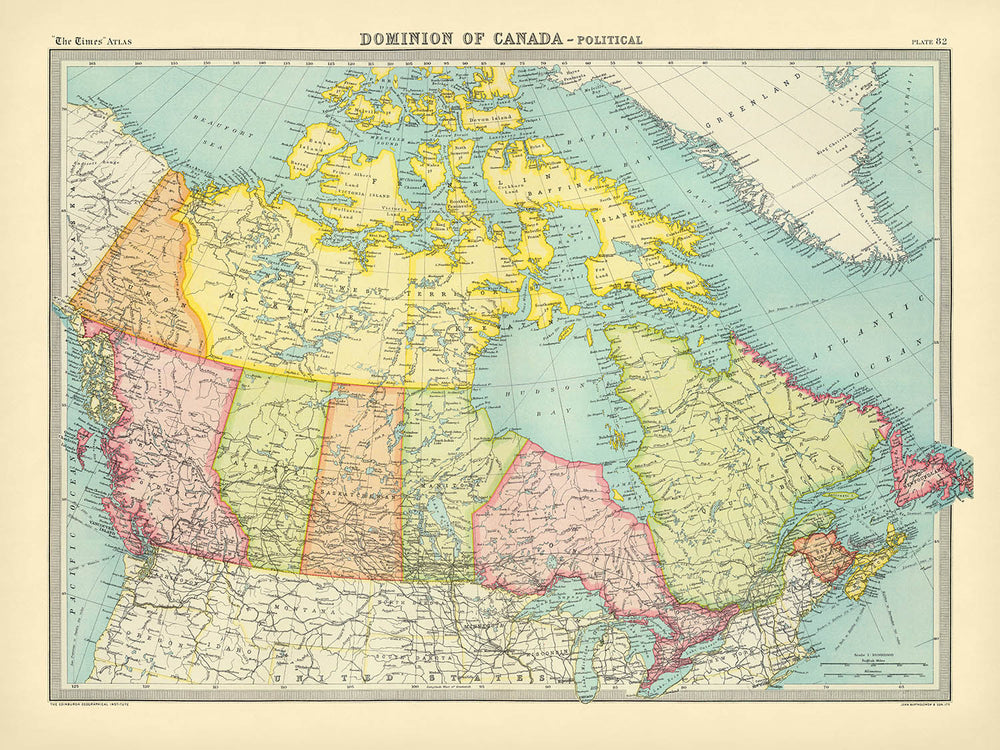 Bartholomew’s artistry shines through in his portrayal of Canada’s monumental natural features. The rugged expanse of the Rocky Mountains rises in the west, their presence rendered with subtle relief and spot heights, while the Laurentian Mountains anchor the landscape of Quebec. Major rivers such as the St. Lawrence, Mackenzie, and Fraser snake across the map, tracing the arteries of commerce and exploration that shaped the country’s history. Vast bodies of water—including Hudson Bay, the Great Lakes, and the Gulf of St. Lawrence—are depicted with a clarity that invites the viewer to imagine the journeys of ships and settlers across these formidable frontiers.