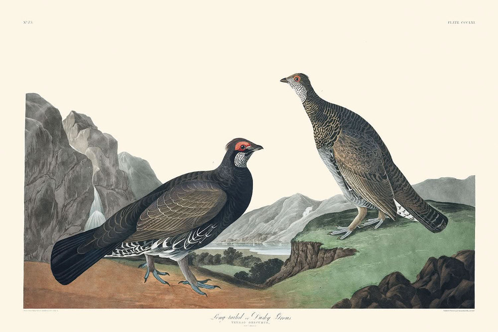 The "Long-tailed, or Dusky Grouse", or Tetrao obscurus, is illustrated with painstaking care, revealing the subtleties of its morphology and plumage. This bird's habitat stretches from the Rocky Mountains to the Columbia River, which provided a rich context for Audubon's interpretation. The artwork is complemented by observations from early naturalists, adding a scientific depth to its artistic beauty.