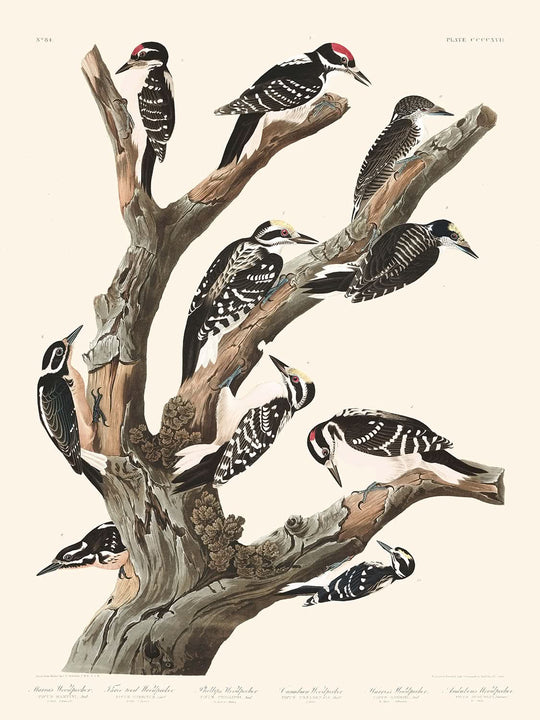 Maria's Woodpecker, Three-toed Woodpecker, Phillips' Woodpecker, Canadian Woodpecker, Harris's Woodpecker, Audubon's Woodpecker (Plate 417) captures the essence of the vibrant and intricate illustrations found in John James Audubon's renowned collection, "Birds of America." Created in 1827, this illustration offers an insight into the avian wonders meticulously documented by Audubon—a testament to his dedication to understanding and portraying the natural world.