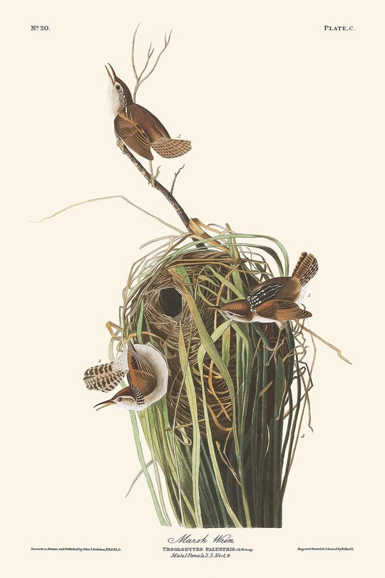 Marsh Wren, first published in 1827, is one of the captivating bird illustrations from John James Audubon's renowned series, The Birds of America. This particular artwork captures the essence of the Marsh Wren, depicting its natural habitat along the Atlantic shores and the marshes at the river inlets.