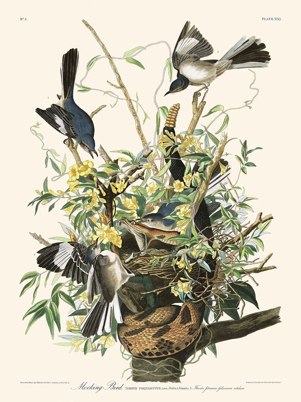 Mocking Bird (Plate 21), first published in 1827, is one of the enchanting illustrations from John James Audubon’s celebrated work, The Birds of America. This exquisite piece captures the vibrant and detailed essence of the mockingbird amid the lush landscapes of Louisiana, where colorful flora and melodious fauna create a harmonious natural symphony.