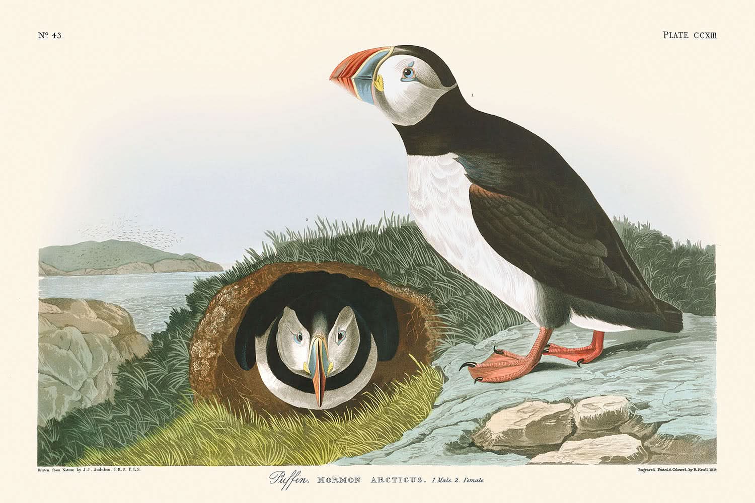 Puffin, a captivating bird illustration by John James Audubon, was first published in 1827 as part of his monumental work, The Birds of America. This majestic artwork depicts the charming bird known as the "Sea Parrot" along the eastern coasts of the United States with exquisite detail, capturing both its grace and its rich natural habitat.
