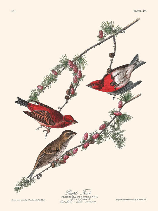 The Purple Finch (Fringilla purpurea), featured in this illustration, captures the essence of this charming bird known for its undulating flight patterns and vibrant plumage. The precision in Audubon's work, from the rich lake-like reds of the Finch's feathers to the delicate highlights, speaks to his prowess in capturing the nuances of avian beauty. This fine art print not only serves as an exquisite piece of wall art but also as a window into the natural world at its most beautiful.
