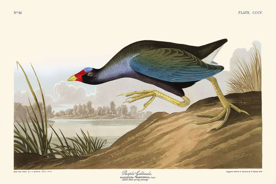John James Audubon's "Purple Gallinule" (Plate 305) is a breathtaking illustration from his renowned series, "Birds of America," published in 1827. Audubon, celebrated for his detailed and vibrant depictions of North American bird species, captures the ethereal beauty of the Purple Gallinule in this piece. Originating from the southern United States, this bird wades elegantly across the broad leaves of water lilies, bringing a small piece of America's natural splendor into your home.