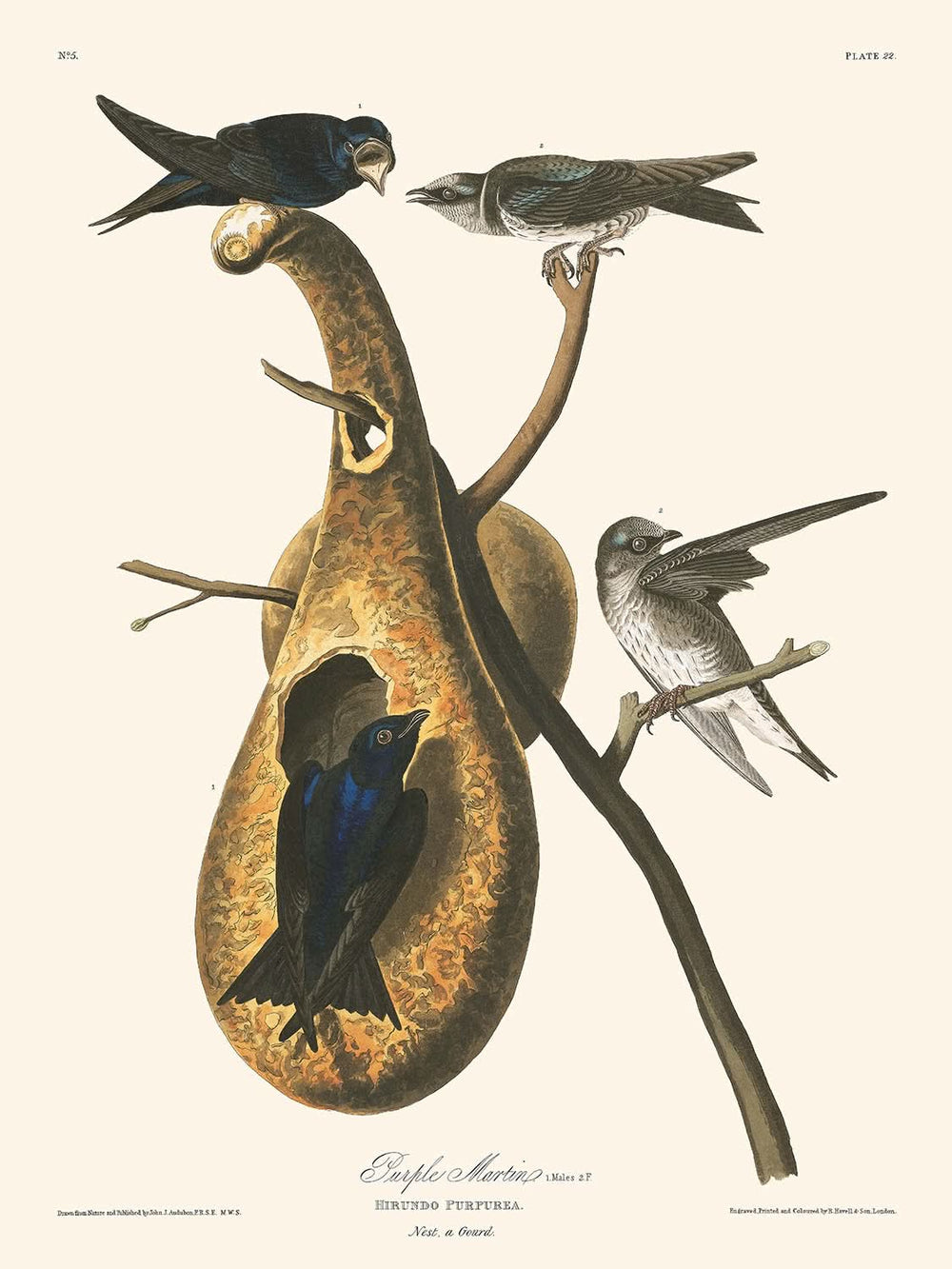 Purple Martin (Plate 22), first published in 1827, is a highly regarded illustration from John James Audubon's celebrated series, Birds of America. This exquisite portrayal captures the vibrant energy and migratory behavior of the Purple Martin, a species noted for its agile flight and social nesting habits.