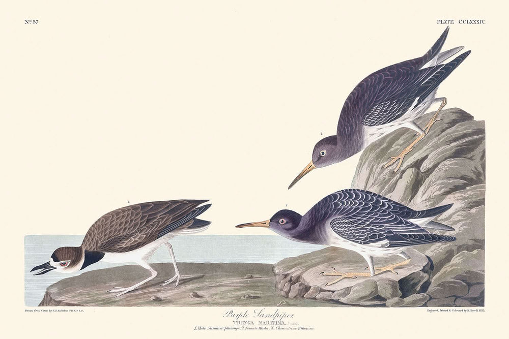 Purple Sandpiper, first published in 1827, is a captivating bird illustration by John James Audubon, from his renowned work, The Birds of America. Audubon’s remarkable dedication to capturing the avian life of North America is highlighted in this beautifully detailed depiction of the Purple Sandpiper. Reflecting a harmonious blend of artistry and scientific observation, this piece showcases the artist's ability to document both the aesthetic and biological features of his subjects.