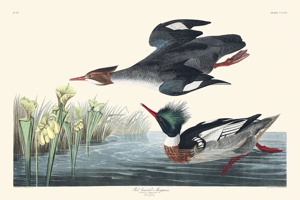 Red-breasted Merganser, first published in 1827, is a striking and detailed bird illustration by John James Audubon, part of his celebrated series, The Birds of America.