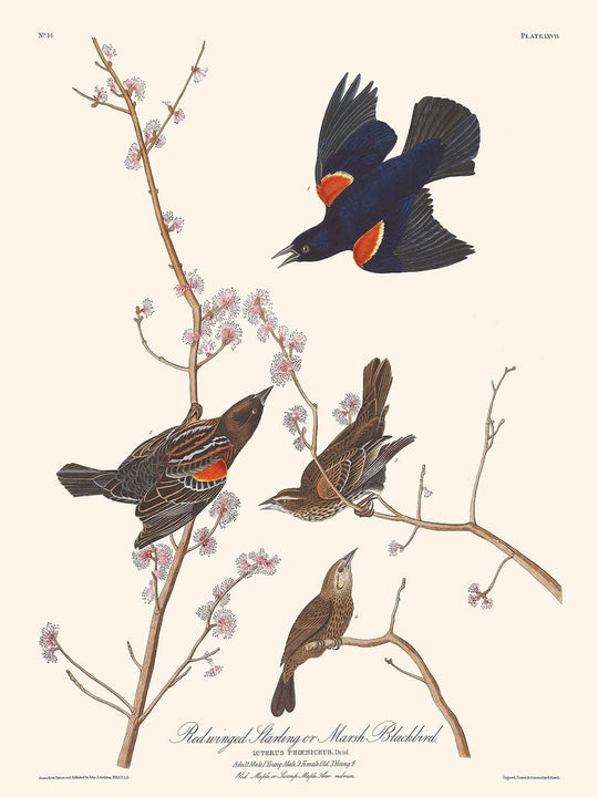 Red-winged Starling, or Marsh Blackbird, meticulously illustrated by John James Audubon, was first published in 1827 as part of his celebrated collection, The Birds of America. This captivating portrayal of the Red-winged Starling offers a glimpse into the artist's profound appreciation of avian life and the intricate ecosystems they inhabit.