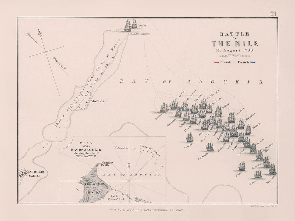 A.K. Johnston was a renowned figure of his time, known for his meticulous and informative map artistry, which played an instrumental role in historical cartography. This particular lithograph is not only a map but an artistic reconstruction of a pivotal naval engagement, brought to life through vivid engravings and hand-coloring. It uniquely presents the tactical positioning of British and French naval forces with an inset map detailing the Bay of Aboukir—a feature that takes the viewer deep into the strategic core of this historical event.