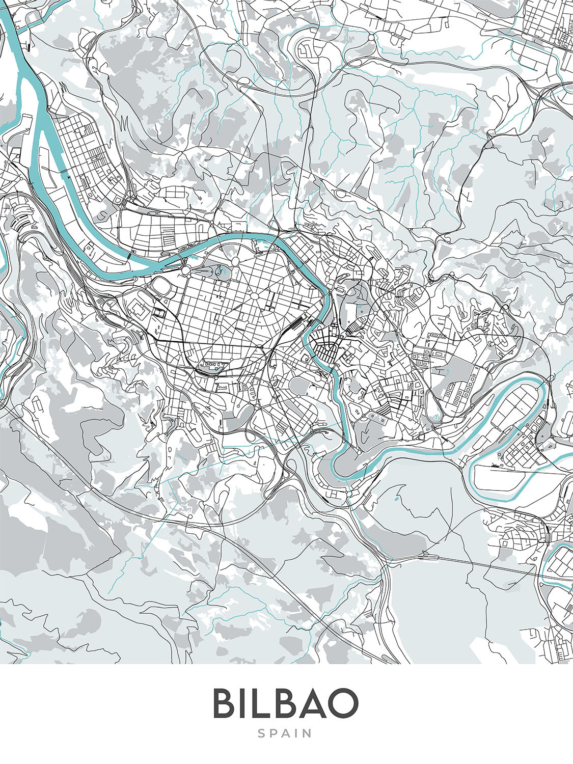 This map of Bilbao is a modern masterpiece that captures the essence of this vibrant Spanish city. With its clean lines and minimalist design, this map is a true work of art that will add a touch of sophistication to any home or office. The map focuses on the central area of Bilbao, showcasing its most iconic neighborhoods and landmarks.