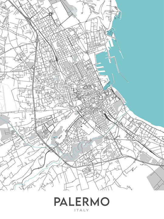 This map of Palermo offers a modern and detailed view of the city, capturing its vibrant energy and rich history. The map focuses on the central area of Palermo, encompassing a diverse range of neighborhoods, from the historic Albergheria and Kalsa districts to the elegant Politeama and Tribunali-Castellammare areas. It also includes the iconic landmarks that make Palermo a must-visit destination, such as the majestic Palermo Cathedral, the opulent Palazzo dei Normanni, and the grand Teatro Massimo.