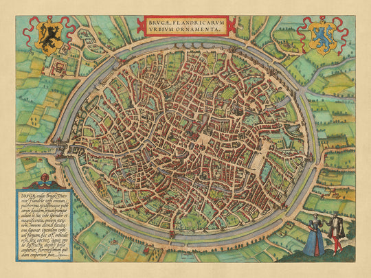 Adding to the map's charm are the thoughtful illustrations that accompany it, including a couple standing in the lower right corner, symbolizing perhaps the life and spirit of the city's inhabitants. The decorative cartouche in the upper left corner further enhances the map's aesthetic appeal, making it not only a historical document but also a work of art. These artistic elements, coupled with the map's detailed representation of Bruges, make it a captivating piece for collectors, historians, and art enthusiasts alike.