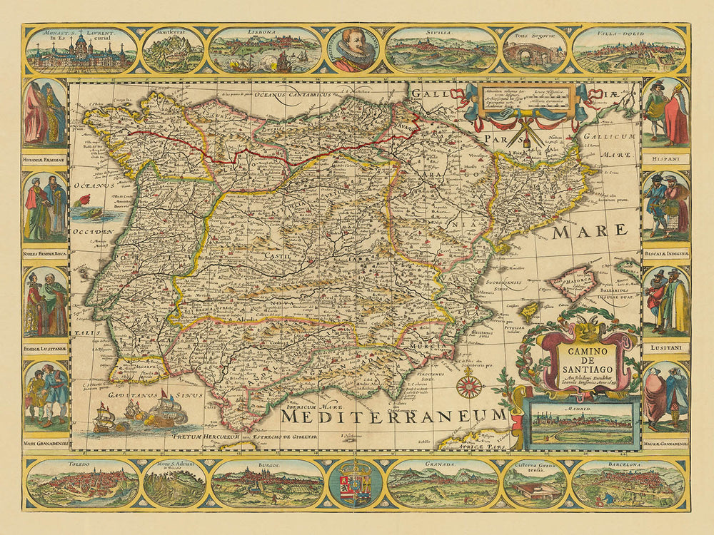 Step into the world of 17th-century cartography with the evocative “Camino de Santiago” map, originally crafted by the masterful Jan Jansson and reimagined by The Unique Maps Co. This remarkable piece, first published in 1659, elegantly charts the legendary Camino Francés pilgrimage route, winding from Saint-Jean-Pied-de-Port in France to the sacred city of Santiago de Compostela in Galicia, Spain. The route, highlighted in a striking red, draws the eye across the Iberian Peninsula, tracing the footsteps of countless pilgrims who have journeyed this path for centuries.