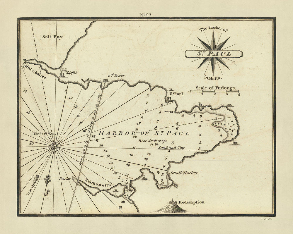 This particular chart is uniquely oriented with south at the top, a feature that distinguishes it from many other nautical maps of the period. It meticulously documents the harbor of St. Paul's Bay in Malta, showcasing an array of soundings, topographical features, and anchorages. The inclusion of these details not only provided essential information for navigation but also offers a glimpse into the geographical understanding of the time. The chart's precision in depicting various maritime elements, including the depths and coastal outlines, makes it an invaluable resource for understanding 18th-century naval navigation.