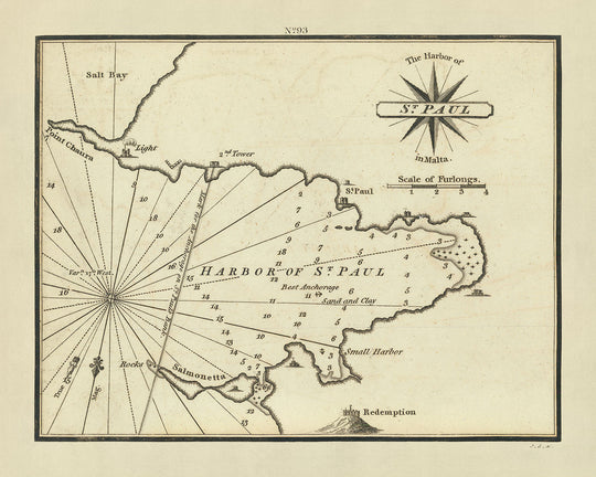 Among the notable features illustrated on the chart are several lighthouses and towers, crucial for the sailors' orientation, including the enigmatic "Redemption" tower near Għajn Ħadid Tower. The presence of these structures highlights the strategic importance of St. Paul's Bay as a safe anchorage and a point of reference for sailors navigating the perilous waters of the Mediterranean. The detailed rendering of these aids to navigation underscores the chart's utility and historical significance.