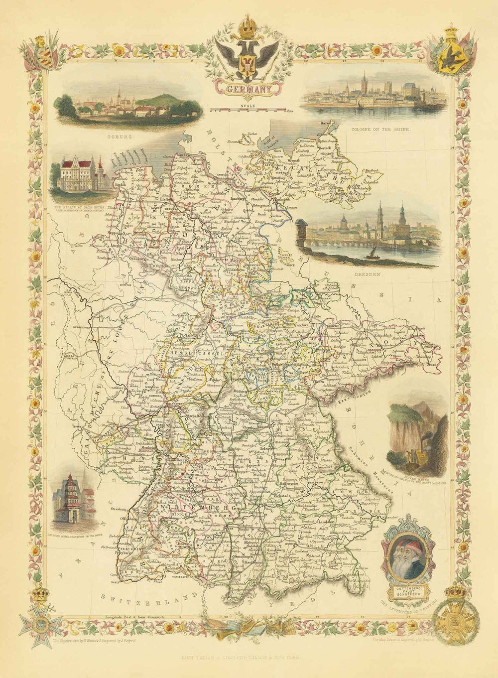 Engraved by John Rapkin and published by J. Tallis & Co in 1851, this is one of the finest and most detailed historic maps of Germany.
