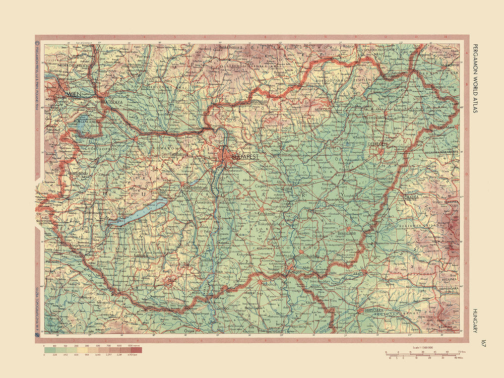 Old Map of Hungary, 1967: Budapest, Danube River, Lake Balaton, Great Hungarian Plain, Mátra Mountains