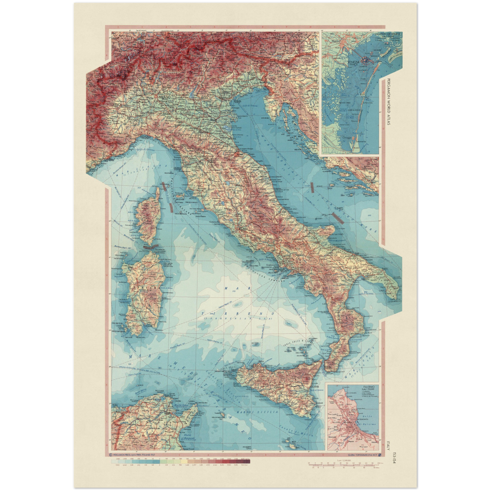 One of the most striking features of the map is the detailed representation of the islands of Corsica, Sardinia, and Sicily. Each island is rendered with a level of precision that captures their unique geographical features and landmarks. The map also highlights the strategic importance of these islands in the Mediterranean, nestled between the Tyrrhenian and Adriatic Seas. The map also features insets of Palermo and Venezia (Venice), offering a closer look at these iconic cities and their intricate urban landscapes.