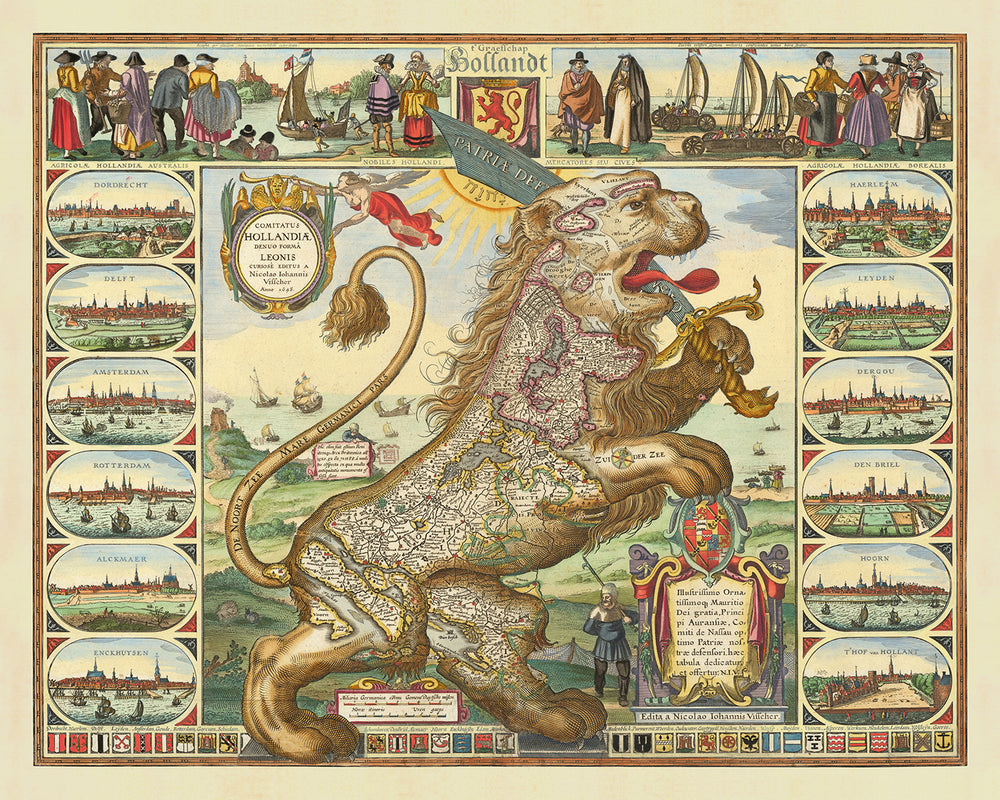 Old Map of Leo Belgicus (Low Countries Lion) by Visscher, 1648: Amsterdam, Rotterdam, Antwerp, Brussels, Ghent