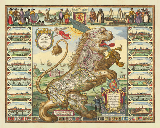 This beautiful old map of the Low Countries, also known as Leo Belgicus, was created by Claes Janszoon Visscher in 1648. The map is in the shape of a lion, with the head at Amsterdam and the tail at Luxembourg. The five most significant locations shown on the map are Amsterdam, Rotterdam, Antwerp, Brussels, and Ghent.
