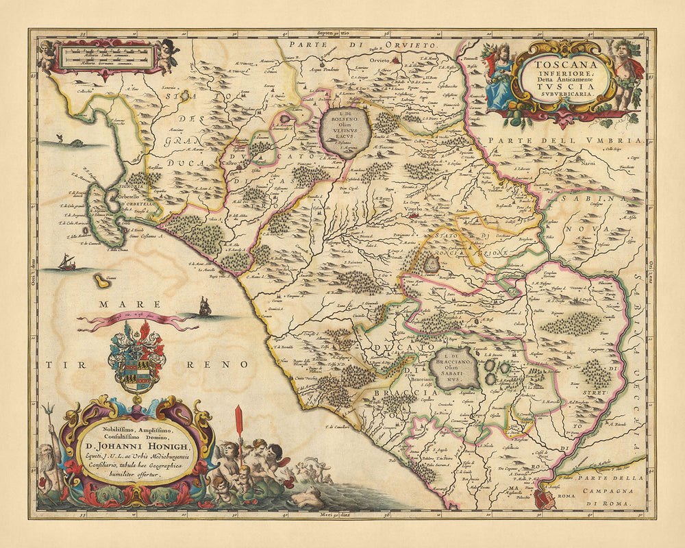 The map features several significant cities and landmarks, including Viterbo, Rome, Orvieto, Civitavecchia, and Parco Naturale Regionale di Bracciano Martignano. Each city is represented with remarkable accuracy, reflecting the meticulous attention to detail that was a hallmark of Visscher's work. These cities, rich in history and culture, are beautifully captured in this piece, offering a glimpse into the past that is both fascinating and educational.