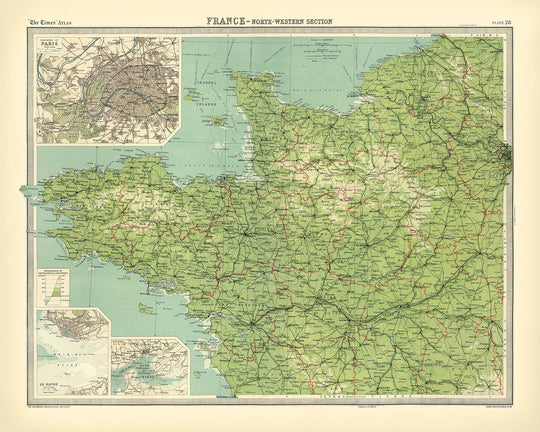 Step into the intricate world of early twentieth-century cartography with “France - north-western section, environs of Paris,” a masterwork created in 1922 by the esteemed J. G. Bartholomew. This map is not merely a navigational tool but a testament to a pivotal moment in the evolution of atlas-making, representing the first time Bartholomew’s distinctive cartographic vision replaced the earlier Andree maps in "The Times" Atlas and Gazetteer of the World. The original title hints at the map’s dual focus: the bustling metropolis of Paris and the diverse, storied landscapes that radiate from its heart into the north-western reaches of France.