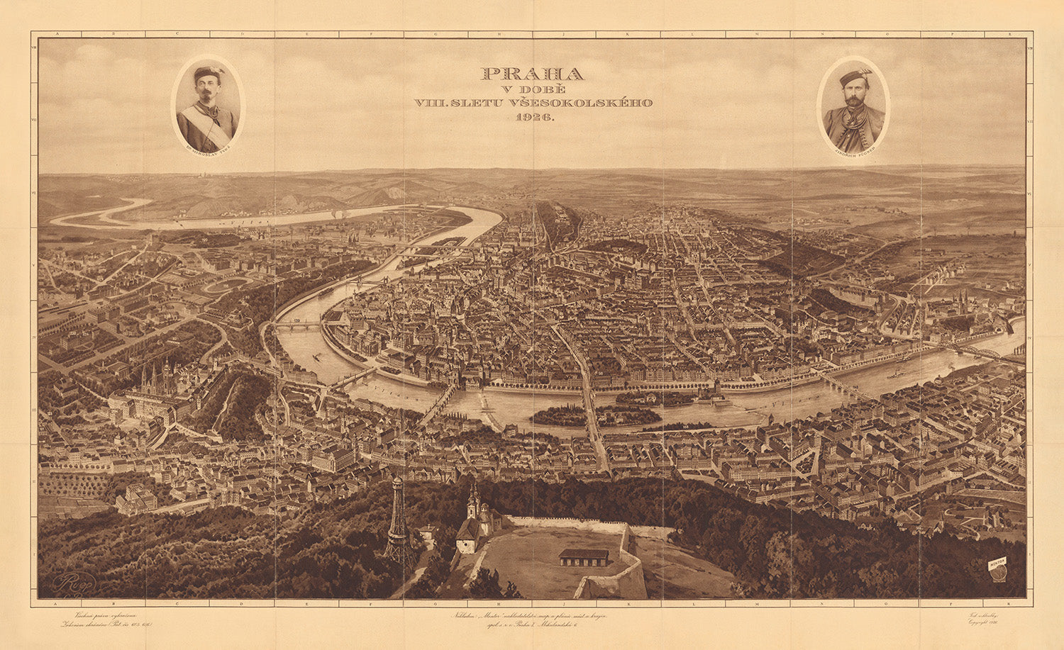 Old Birdseye Map of Prague by Mentor, 1926: Petrin Tower, Prague Castle, Mala Strana, Old Town, All Sokol Rally