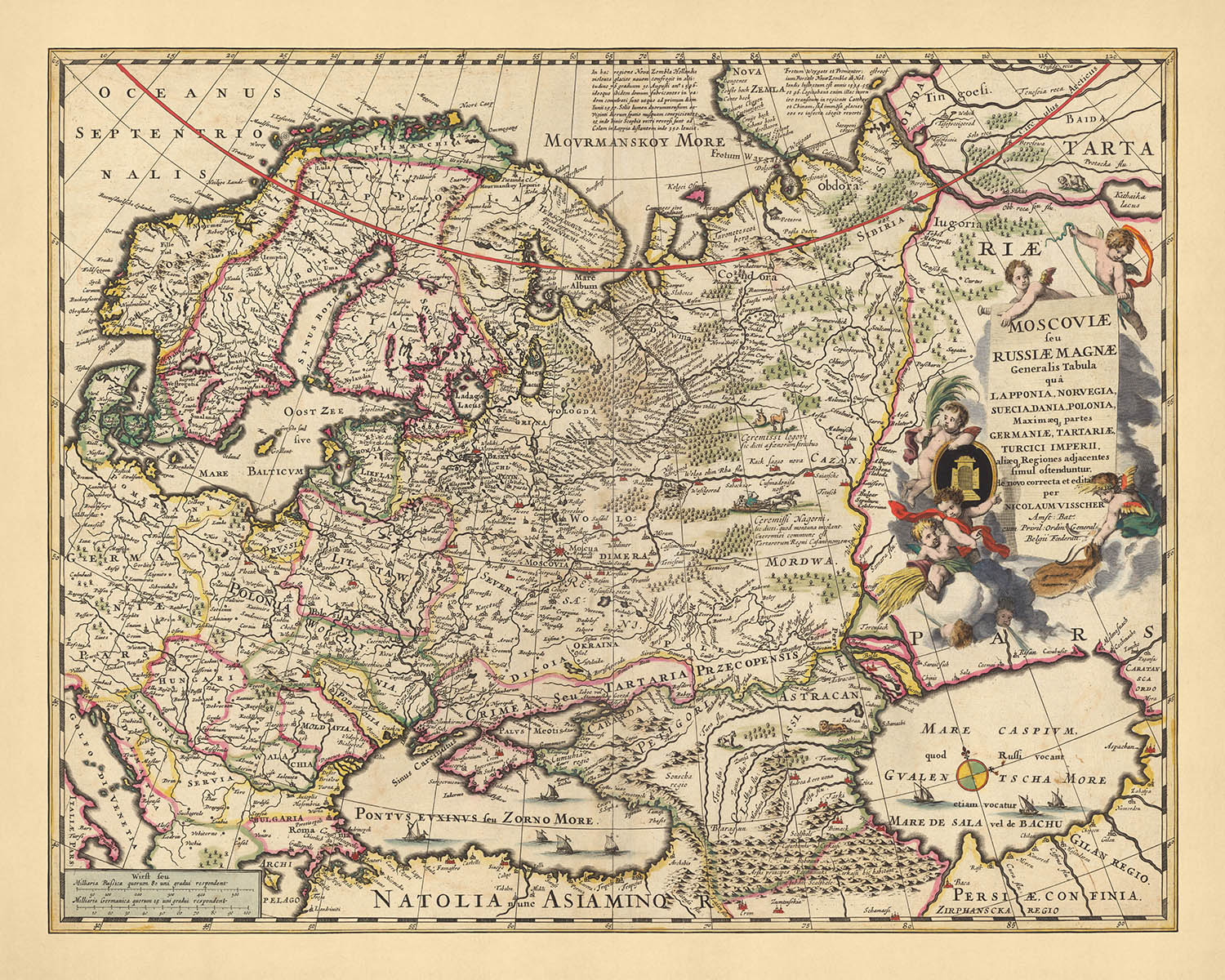Old Map of Russia by Visscher, 1690: Moscow, Warsaw, Budapest, Oslo, Stockholm