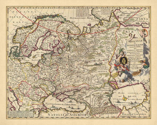 Visscher's map also provides insight into the natural landscapes and geographical features of the region. It showcases the vastness of the Russian terrain, from the Ural Mountains that serve as a natural border between Europe and Asia, to the Volga River, Europe's longest river, flowing through central Russia. The map also hints at the Arctic tundra of Lapland and the expansive plains of Tartary, parts of modern-day Central Asia.
