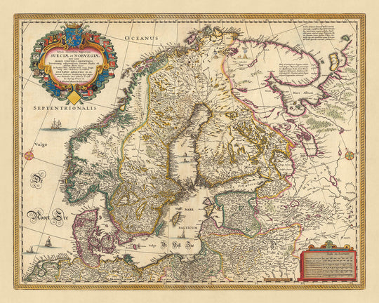 This breathtaking map, titled 'Tabula exactissima Regnorum Sueciae et Norvegiae, nec non Maris Universi Orientalis Terrarumque adjacentium. Summo studio ab Andrea Bureo Sueco in lucem edita ... A Nicolao Iohannide Piscatore', was crafted by Nicolaes Visscher II in 1690. Visscher II was the grandson of Claes Janszoon Visscher, a renowned mapmaker during the Dutch Golden Age. The title translates to 'A very accurate map of the Kingdoms of Sweden and Norway, as well as the entire Eastern Sea and adjacent lands. With great diligence brought to light by the Swede Andreas Bureus ... by Nicolaes Visscher'.