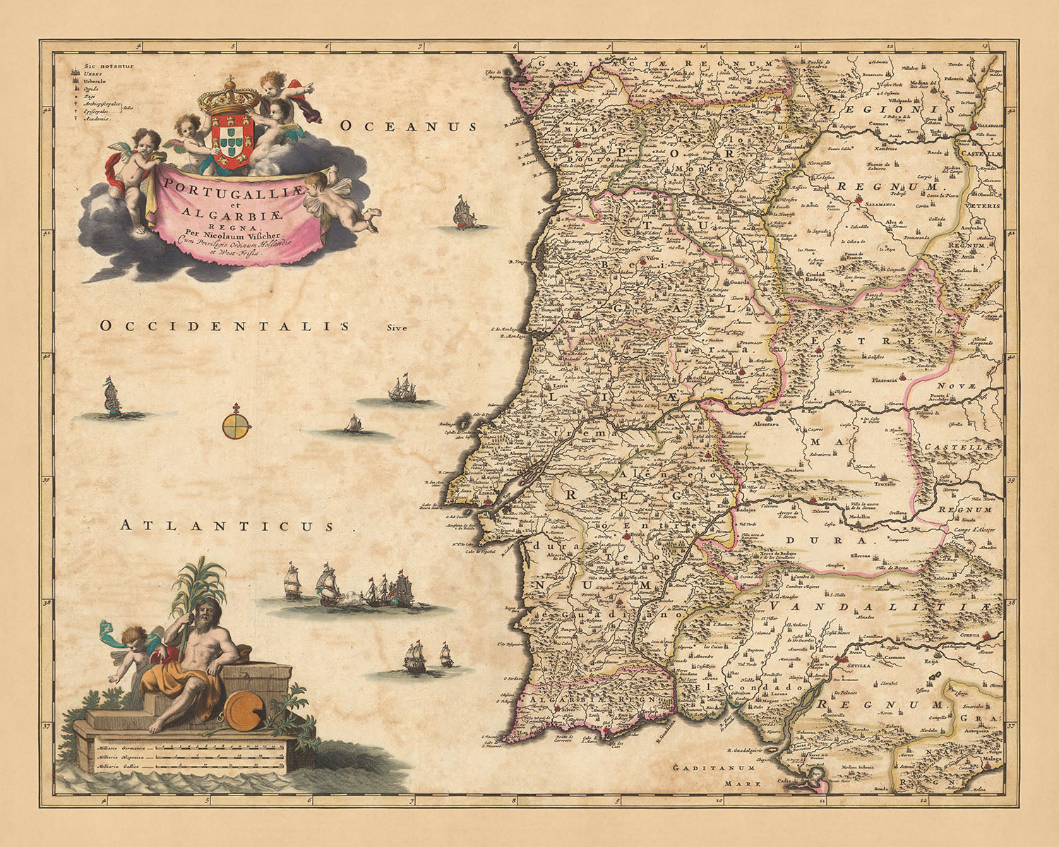 Old Map of the Kingdoms of Portugal & Algarve by Visscher, 1690: Lisbon, Porto, Seville, Salamanca, Serra da Estrela