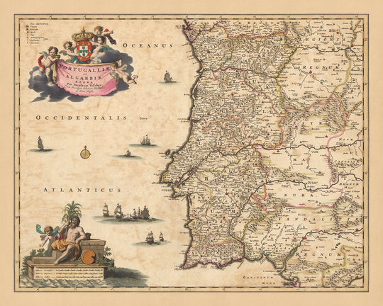 The 'Portugalliae et Algarbiae Regna' is not just a map, but a historical document that portrays the world as it was perceived in the late 17th century. It offers a unique perspective on the administrative boundaries, towns, forests, waterways, canals, mountains, and landmarks of the time. The map is hand-colored in outline and features decorative cartouches, coat of arms, compass roses, and vignettes of ships, all of which add to its charm and historical significance.