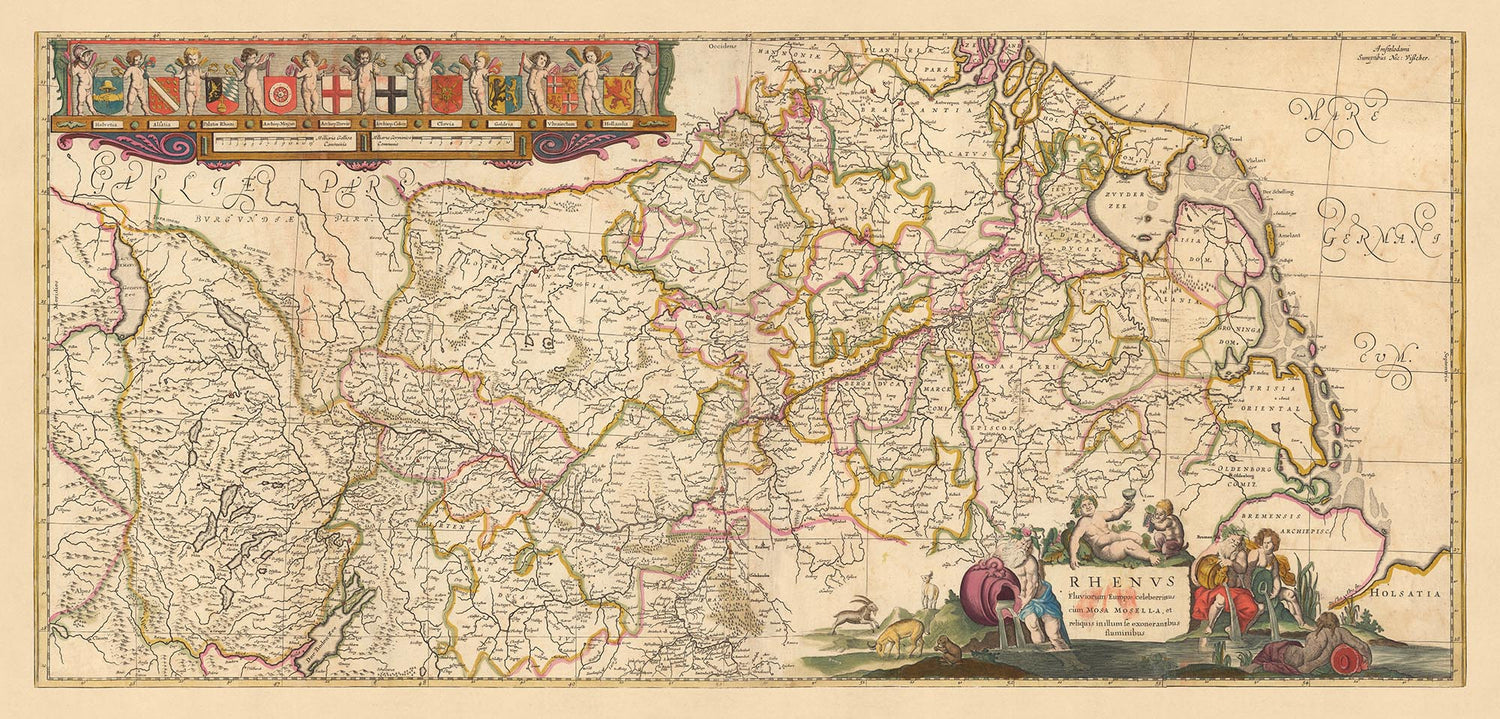 Old Map of the Rhine River by Visscher, 1690: Mouth to Source, Bern, Brussels, Luxembourg, Frankfurt, Cologne