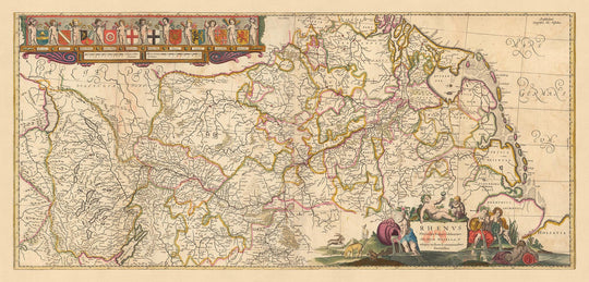 Immerse yourself in the rich history of Europe with this captivating 1690 map of the Rhine River, crafted by the renowned mapmaker Nicolaes Visscher II. The map, originally titled 'Rhenus Fluviorum Europae celeberrimus cum Mosa, Mosella, et reliquis, in illum se exonerantibus, fluminibus', provides an intricate depiction of the political and geographical landscape of the time. Translated, the title reads: 'The Rhine, the most famous of the rivers of Europe, with the Meuse, Moselle, and the rest, which discharge into it'.