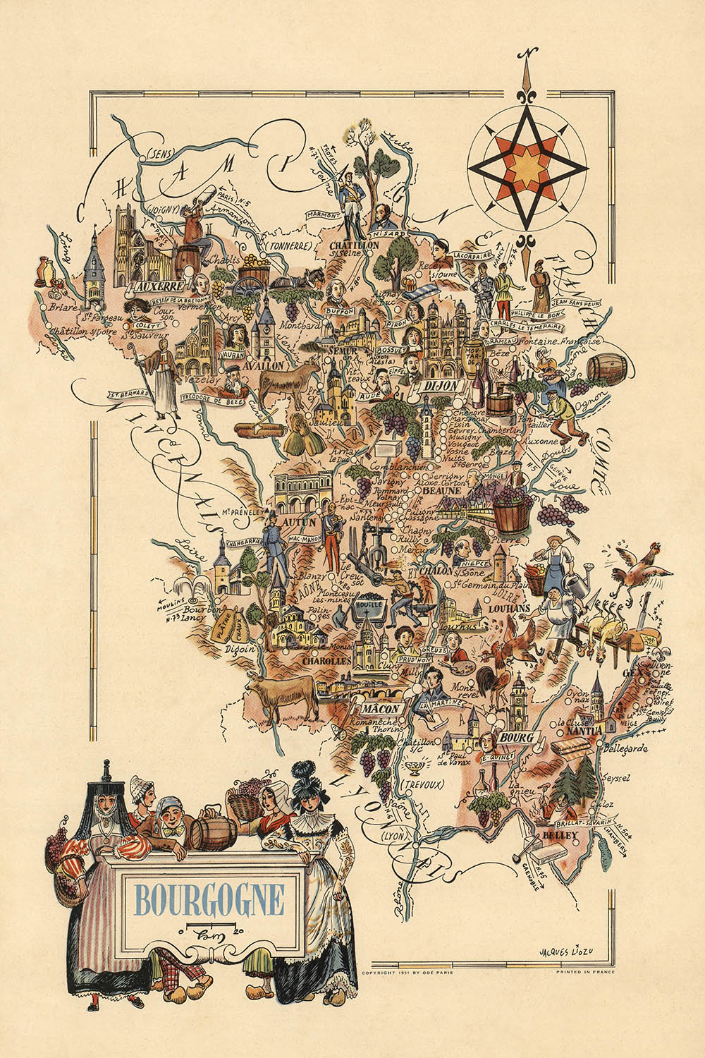 The design of the map is a testament to Liozu's artistic prowess, featuring a decorative compass rose and pictorial relief that adds depth and dimension to the landscape. The map is adorned with illustrations of vineyards, historical landmarks, and local customs, providing a visual feast that captures the essence of Burgundy. The artistic style is both detailed and whimsical, making it a unique piece that stands out in any collection. The use of color and the meticulous attention to detail reflect Liozu's dedication to his craft and his deep appreciation for the region he depicted.