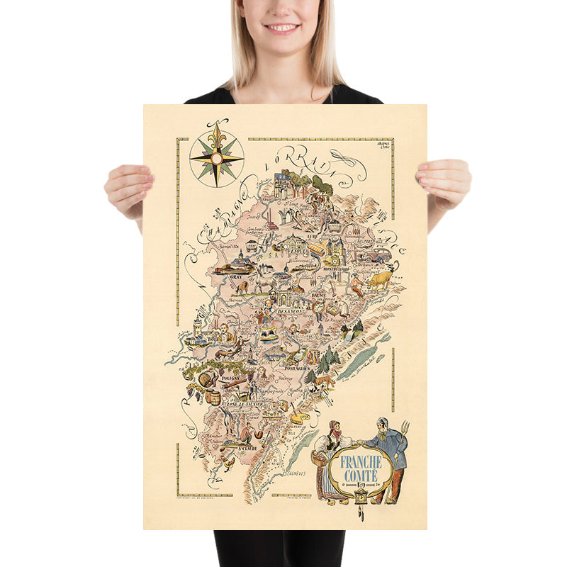 Old Pictorial Map of Franche-Comté by Liozu, 1951: Besançon, Belfort, Montbéliard, Rivers, Castles