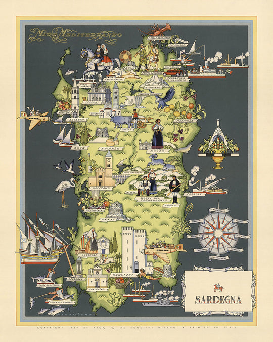 This beautiful and detailed map of the Italian Region of Sardegna was originally published in 1938 by the renowned Italian cartographer, Giovanni De Agostini. It is a thematic and pictorial map, featuring colorful vignettes of structures, nature, activities, products, and crops, as well as towns and cities labeled in Italian. The map is adorned with silver and gilt, adding to its luxurious appearance.