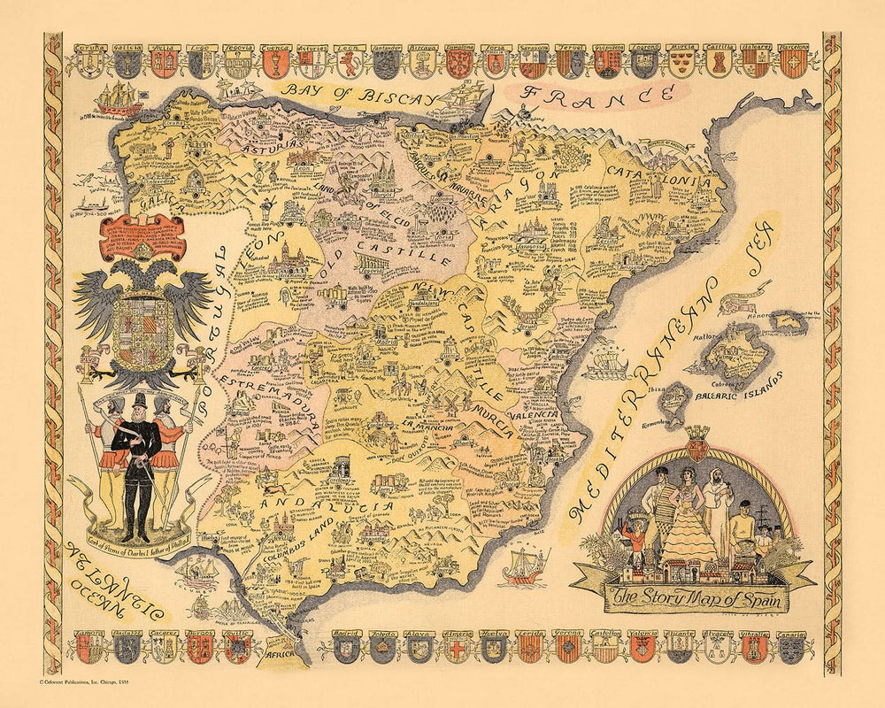 The Story Map of Spain, crafted in 1935 by Colortext Publications, Inc., is a captivating blend of artistry and history. Illustrated by the talented Julio de Diego, this map is more than a geographical representation; it is a visual narrative of Spain's rich cultural tapestry. The map's decorative border, adorned with the Coat of Arms and a portrait of Charles I, sets the stage for a journey through time, where historical and thematic elements converge to tell the story of a nation.