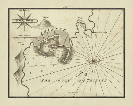 Embark on a historical voyage with "The Port of Trieste," a meticulously detailed chart crafted by the renowned publisher and engraver William Heather in 1802. This chart is not merely a navigational aid but a window into the maritime significance of Trieste during the early 19th century. Positioned uniquely with southeast at the top, this chart is part of Heather's ambitious project, "The New Mediterranean Pilot," which aimed to provide the most comprehensive guide to the Mediterranean's ports. The chart’s inclusion of soundings, anchorages, and other navigational details highlights its practical value for mariners of the time, offering a glimpse into the era's maritime challenges and practices.