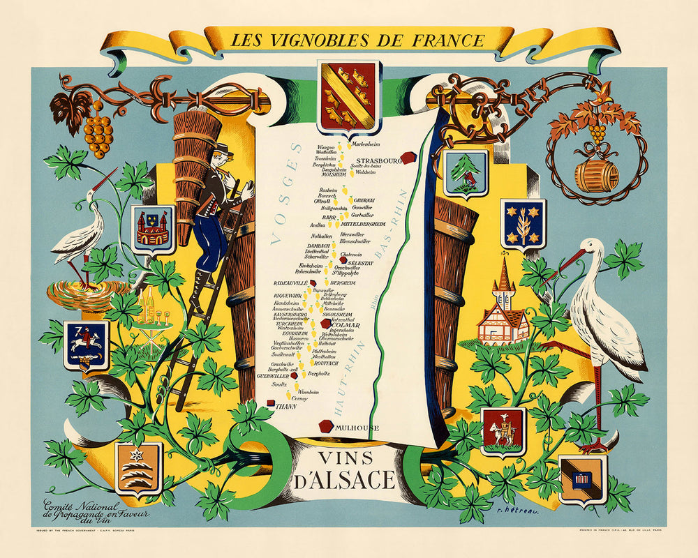 Old Wine Map of Alsace by Hetreau, 1954: Strasbourg, Colmar, Wine Regions