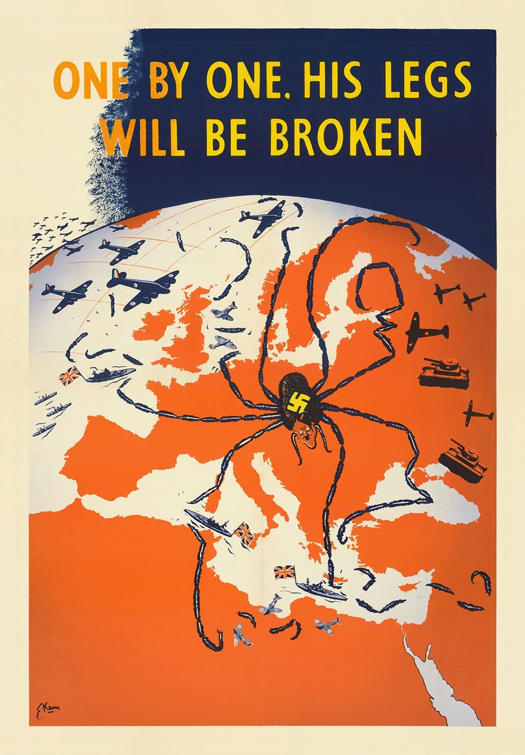 Perhaps one of the most famous and impactful propaganda maps of World War 2, showing Hitler as a spider attacking all of Europe, the Middle East, North Africa, USSR and the Atlantic. The poster was drawn by Kem (Kimon Evan Marengo) and published in 1941.
