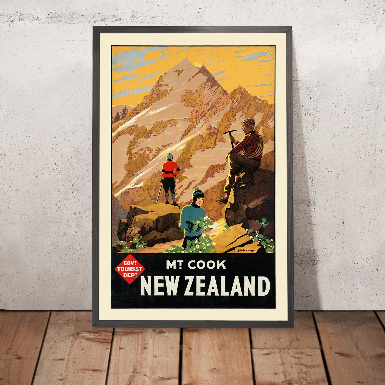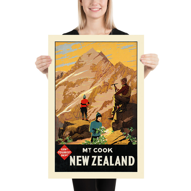 Celebrate the dramatic beauty of Aoraki/Mount Cook with New Zealand. Mt. Cook by Leonard Cornwall Mitchell, an Art Deco travel poster that distills the glamour and optimism of early modern tourism. Mitchell’s design invites the viewer into New Zealand’s Southern Alps: angular peaks soar beneath a sky that softens from pale blue to honeyed gold, while stylized mountaineers in period attire embody the spirit of adventure that drew visitors to this storied landscape.