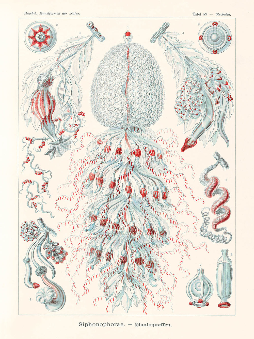 "Siphonophorae Staatsquallen (Tafel 59)" by Ernst Haeckel, published in 1904, is a mesmerizing medusoid polyp zooid illustration from Haeckel's influential work, "Kunstformen der Natur." This artwork features an exquisite arrangement of various zooid species, intricately detailed and with masterful use of color and form that showcases Haeckel's dedication to the natural world.
