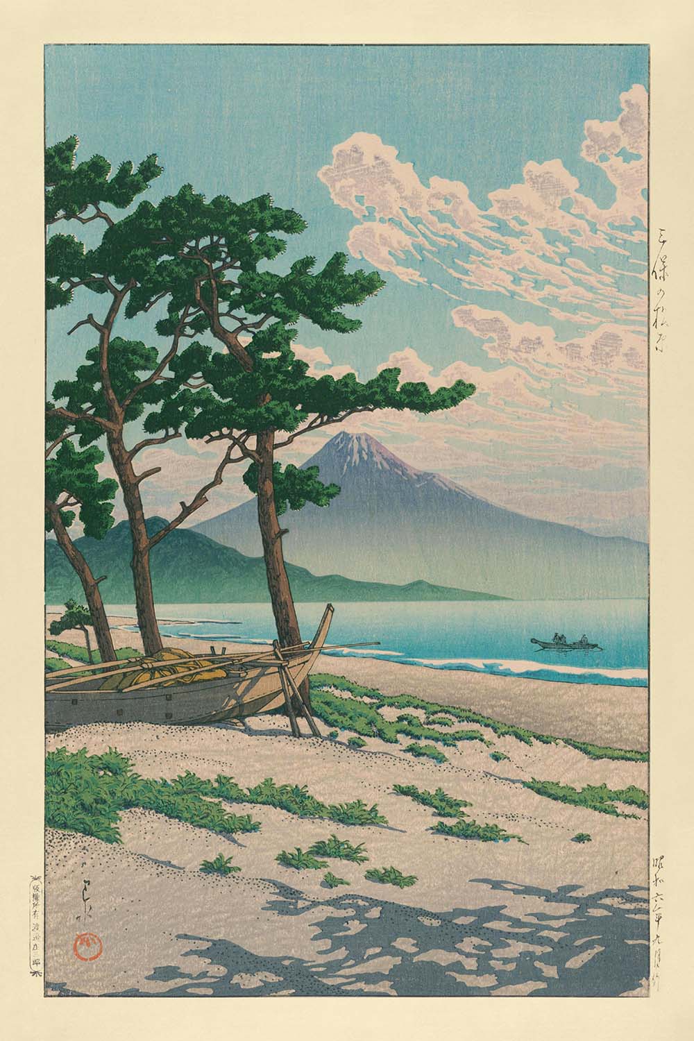 "Pines at Miho Seashore" by Hasui Kawase, created in 1935, is a quintessential work from one of Japan's most revered woodblock print artists. Hasui Kawase was a prominent figure in the Shin-Hanga movement, which sought to rejuvenate the traditional Japanese ukiyo-e art form by infusing it with new influences from Western art. Known for his serene and atmospheric landscapes, Hasui’s work often elicits a sense of peaceful solitude.