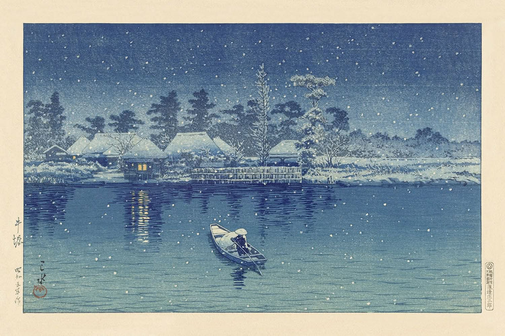 Ushibori by Hasui Kawase, created in 1930, is a captivating example of this renowned artist's work that embodies the serene beauty of traditional Japanese landscapes. Hasui Kawase was a key figure in the Shin-Hanga movement, which revitalized the traditional ukiyo-e woodblock printmaking with Western influences. His work is celebrated for its tranquil scenes and delicate interplay of light and shadow, transporting viewers into a moment of calm reflection.