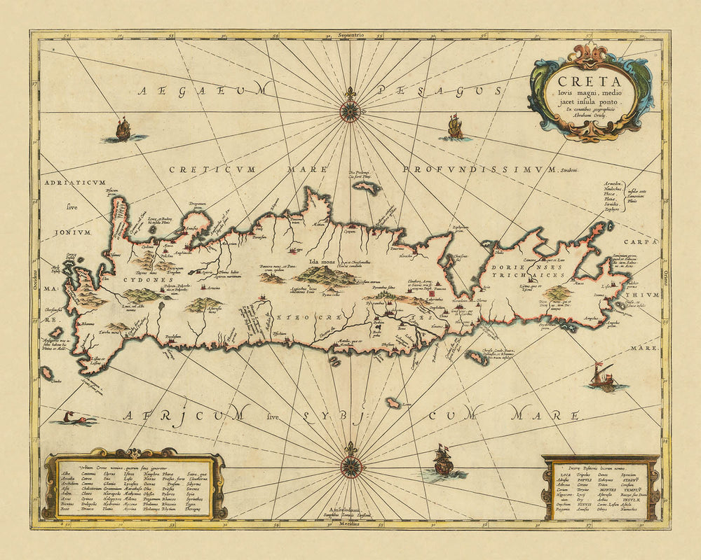 Geographically, the map provides a detailed view of Crete, showcasing its mountains, rivers, and other natural features. The island's boundaries are meticulously drawn, highlighting the cartographer's dedication to accuracy. The bodies of water surrounding Crete, such as the Aegaeum and Creticum Mare, are prominently labeled, emphasizing the island's strategic location in the Mediterranean. This attention to detail underscores the map's value as both a historical document and a piece of art.